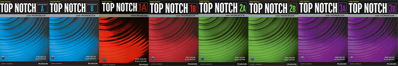 - بعد از کتابهای آبی، کتابهای قرمز تدریس میشوند. Top Notch 1A بخشهای یک تا پنج سری مبتدی را در بر میگیرد.